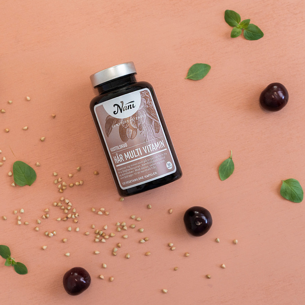 Hår Multivitamin fra Nani er et naturligt multivitamin- og mineraltilskud udviklet til at styrke hår, hud og negle indefra. Produktet indeholder alle 13 vitaminer og 9 mineraler, som udelukkende stammer fra planter, spirer og fermenterede kilder. Resultatet er et 100% naturligt og biotilgængeligt tilskud, hvor kroppen let genkender og optager næringsstofferne.